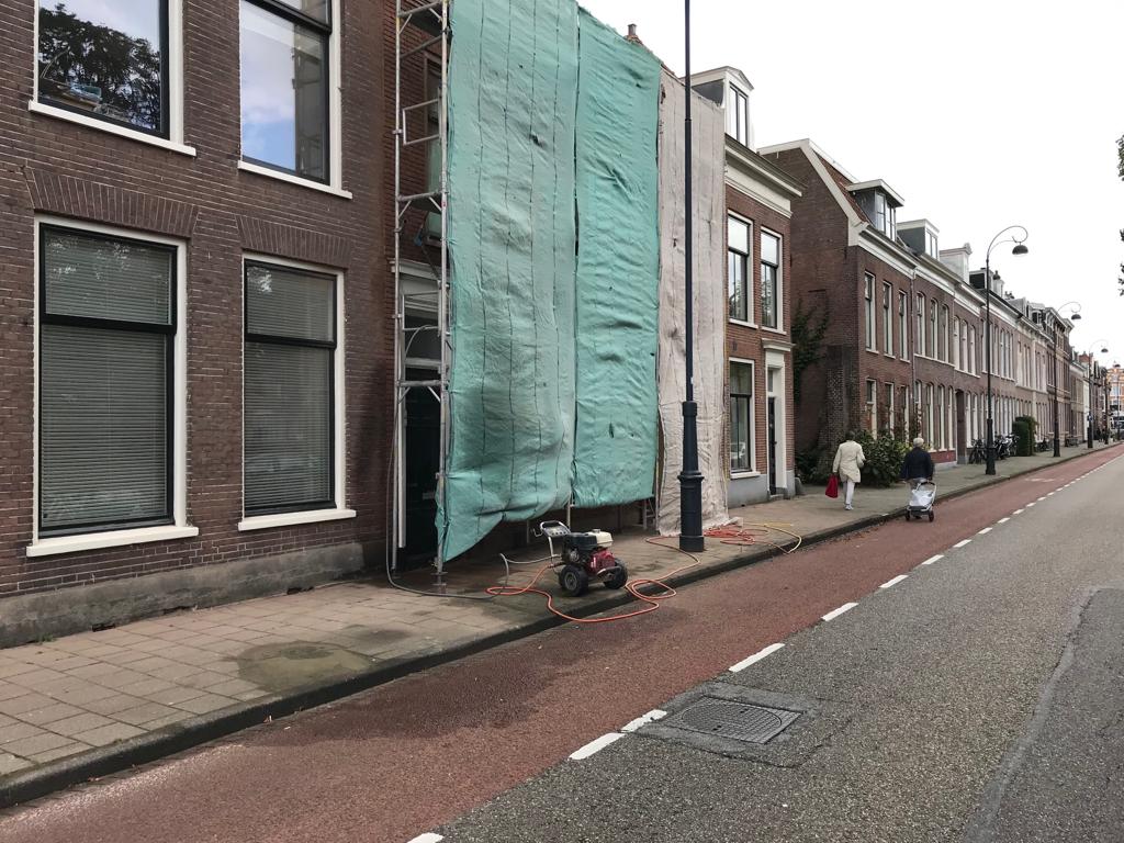 Om geen overlast van het zandstralen te veroorzaken zijn de steigers voorzien van netten.